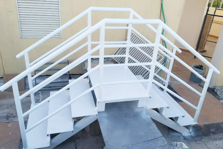 Escaleras y pontones en hierro como soluciones de acceso y estancia en ambientes industriales y educativos.